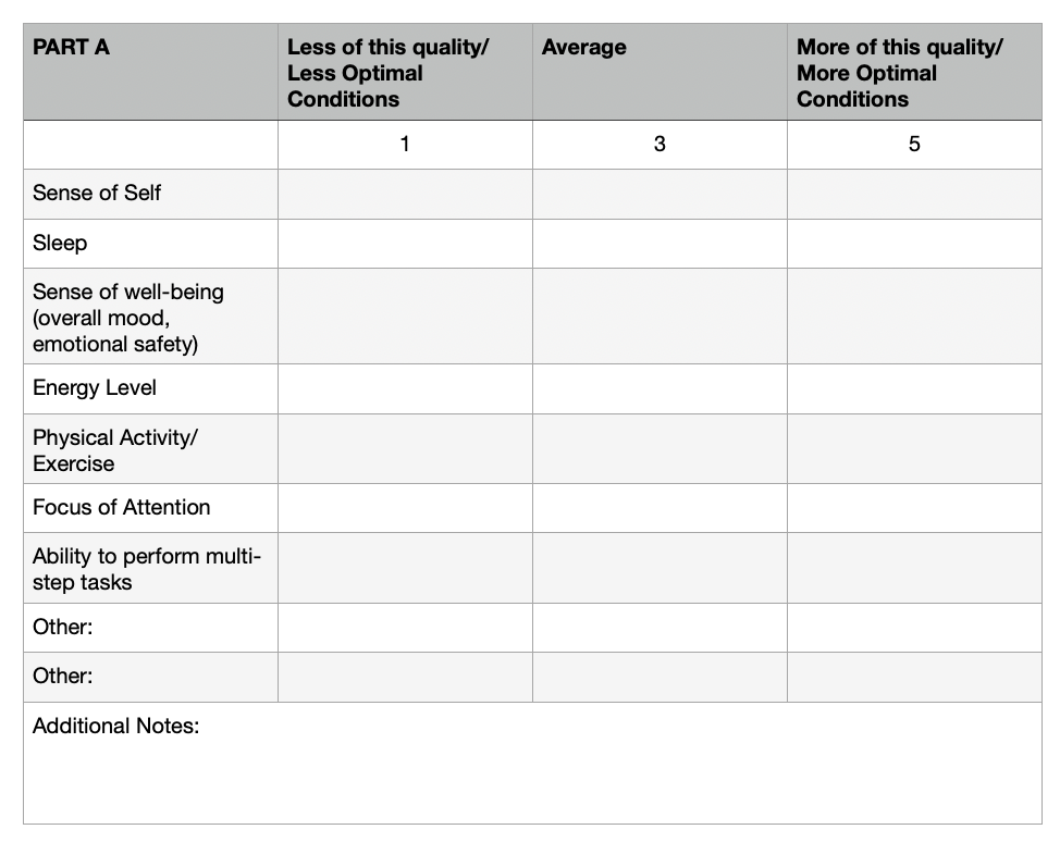 This easy-to-use assessment tool captures some of the most essential aspects of living with Alzheimer’s. More qualities can be added to individualize each person’s particular experience. Parts A and B have benchmarks at 1, 3, and 5, with 5 being the most optimal. Part A looks at aspects that are desirable, while Part B looks at qualities that are not desirable. So in Part B, while 1 refers to less optimal conditions, the corresponding quality, such as anxiety, shows up more at 1 than at 5. Each part has a few rows in which more aspects can be noted. The last row is to note any additional helpful information or even individualize the tool to assess aspects you find relevant.